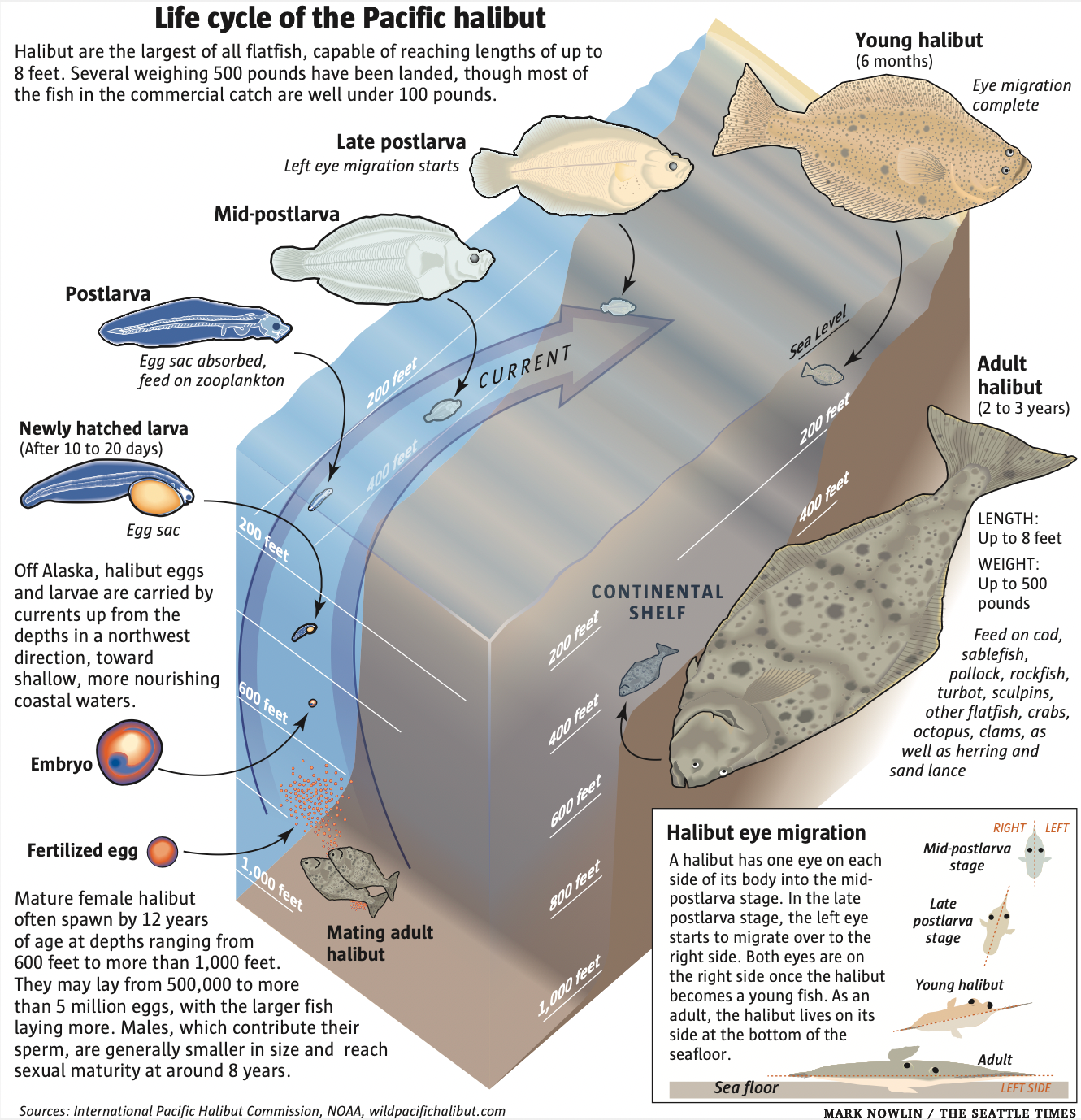 These females, which grow faster and much larger than males, spawn in deep water, often in the Gulf of Alaska. They may release up to several million eggs, which hatch into larvae that may ride the currents for hundreds of miles to reach nutrient-rich shallows favorable to their growth.