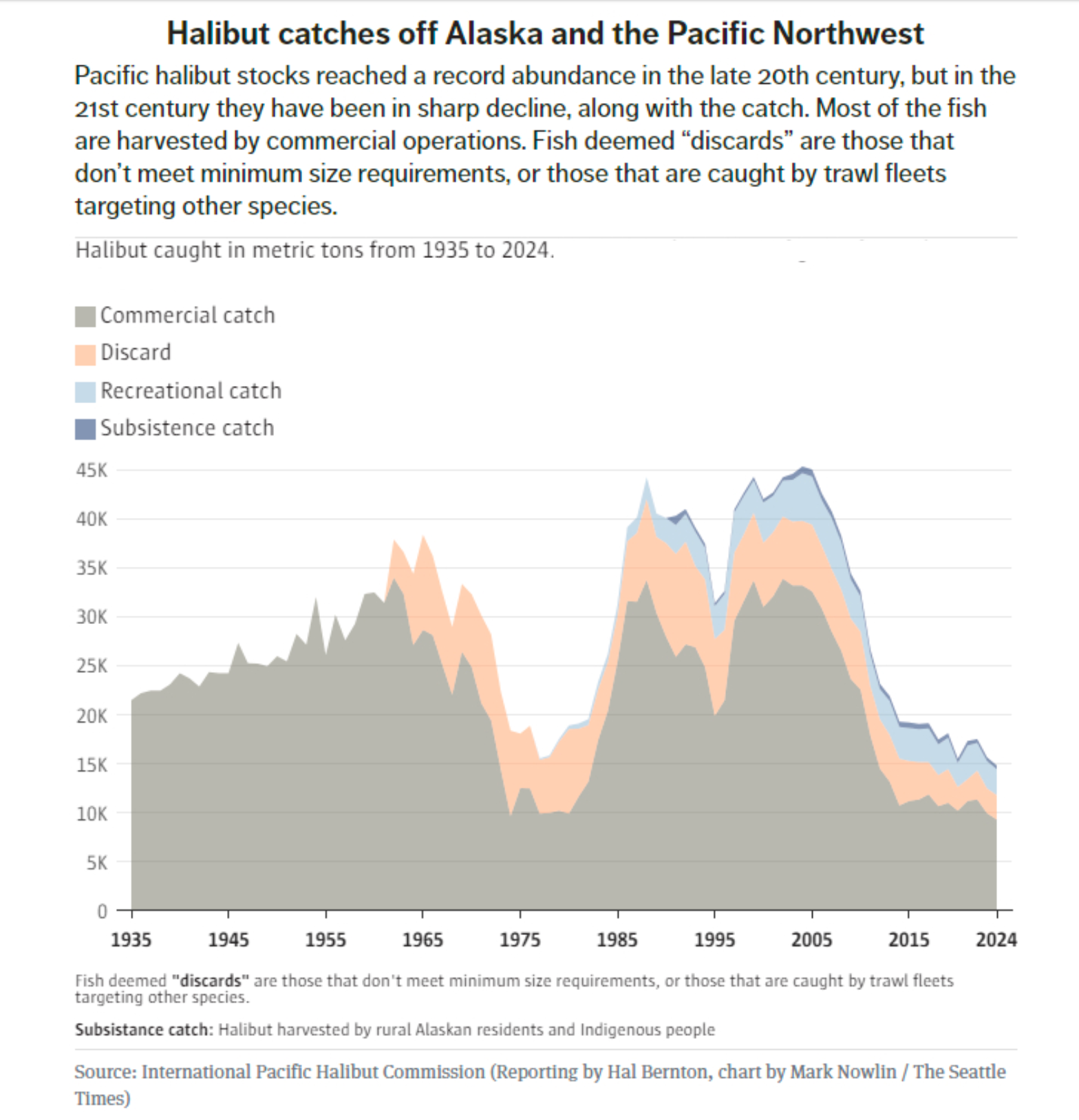 Marine scientists have not found a strong link between climate change and the halibut decline, “though it’s definitely a wild card,” said Stewart, the commission biologist.