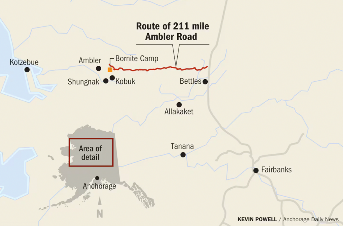 That small Canadian firm holds a 50% interest in Ambler Metals, which is seeking to develop a pair of copper, zinc and cobalt deposits in Northwest Alaska, near the end of the state’s proposed road. Those minerals, the project’s supporters say, are needed to support the global transition to renewable power and to meet growing demand for energy from companies developing artificial intelligence.